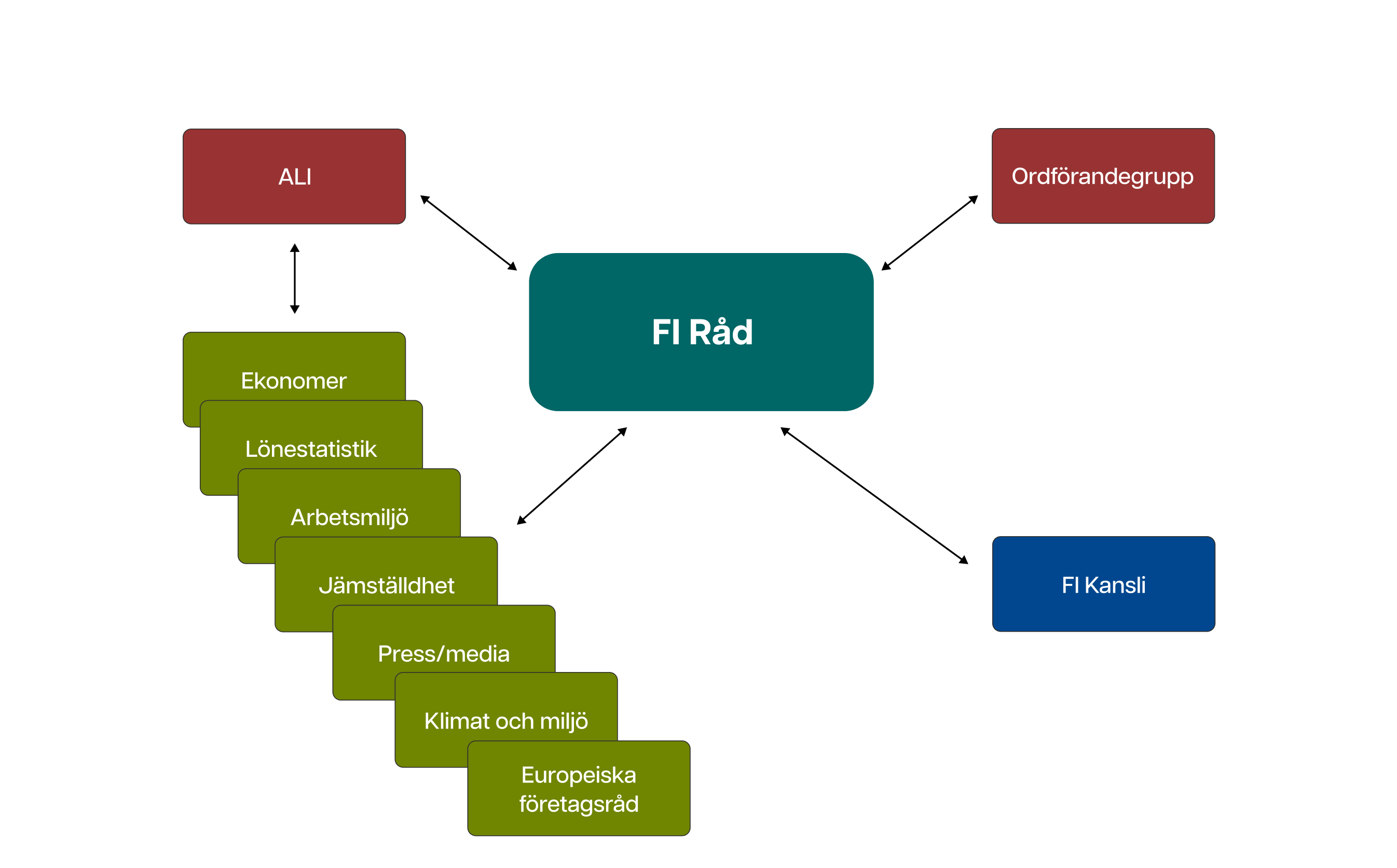 Facken inom industrin leds av FI rådet. Nedanstående bild visar de olika arbetsgrupper som finns inom ramen för samarbetet.